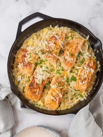 - One Pan Salmon Orzo With Artichokes & Zucchini