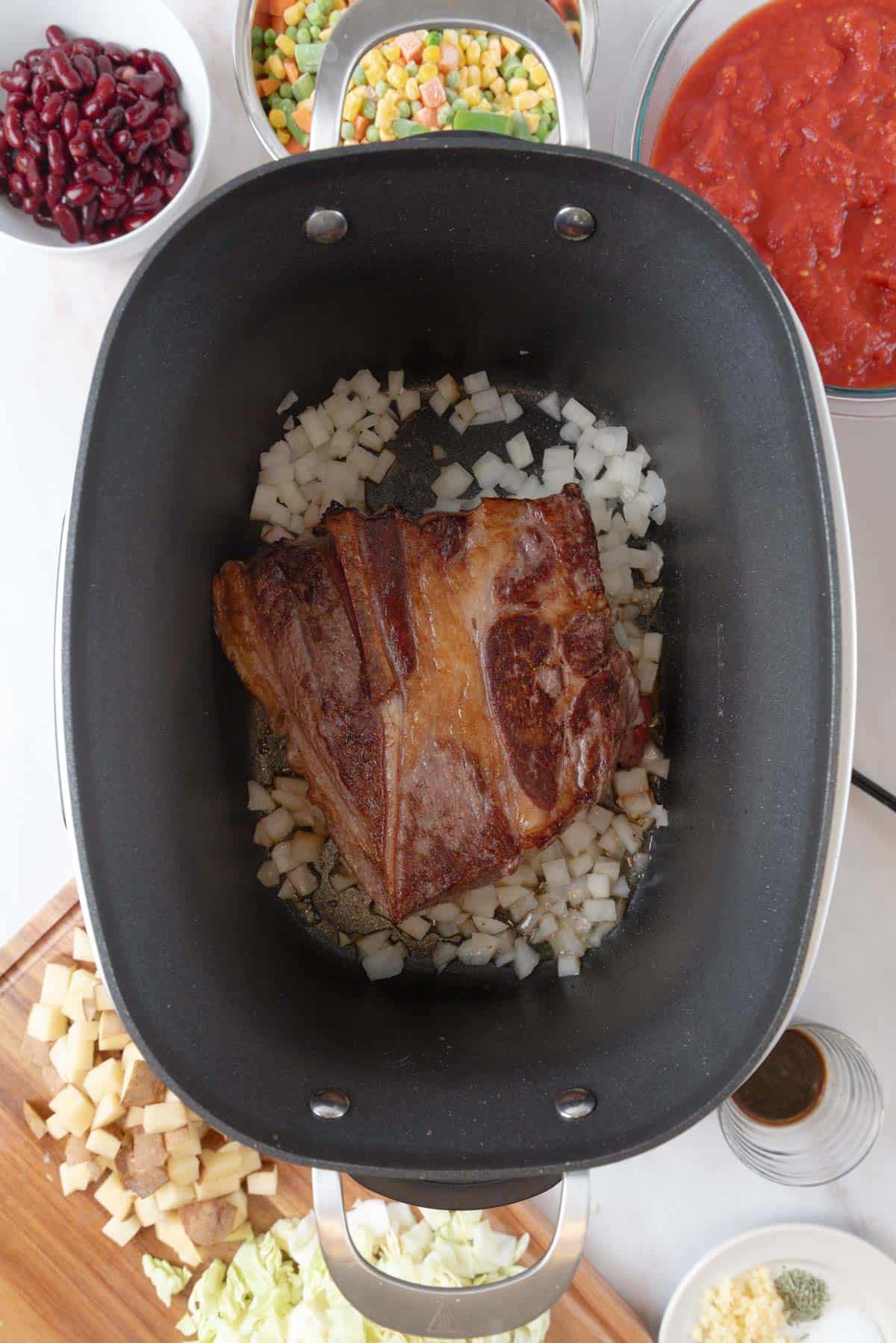 - Step 1: Cut the roast into bite-size pieces or cook whole and shred before serving. In a large skillet or a slow cooker with searing capabilities, heat 2 tablespoons of olive oil. Add the beef and sear the meat for 3-4 minutes on each side until browned. This step helps deepen the flavor of the soup but can be skipped if you're short on time. When flipping the meat to the second side, add in the onions to begin to soften. If searing in a skillet, transfer the meat and onions into the slow cooker.