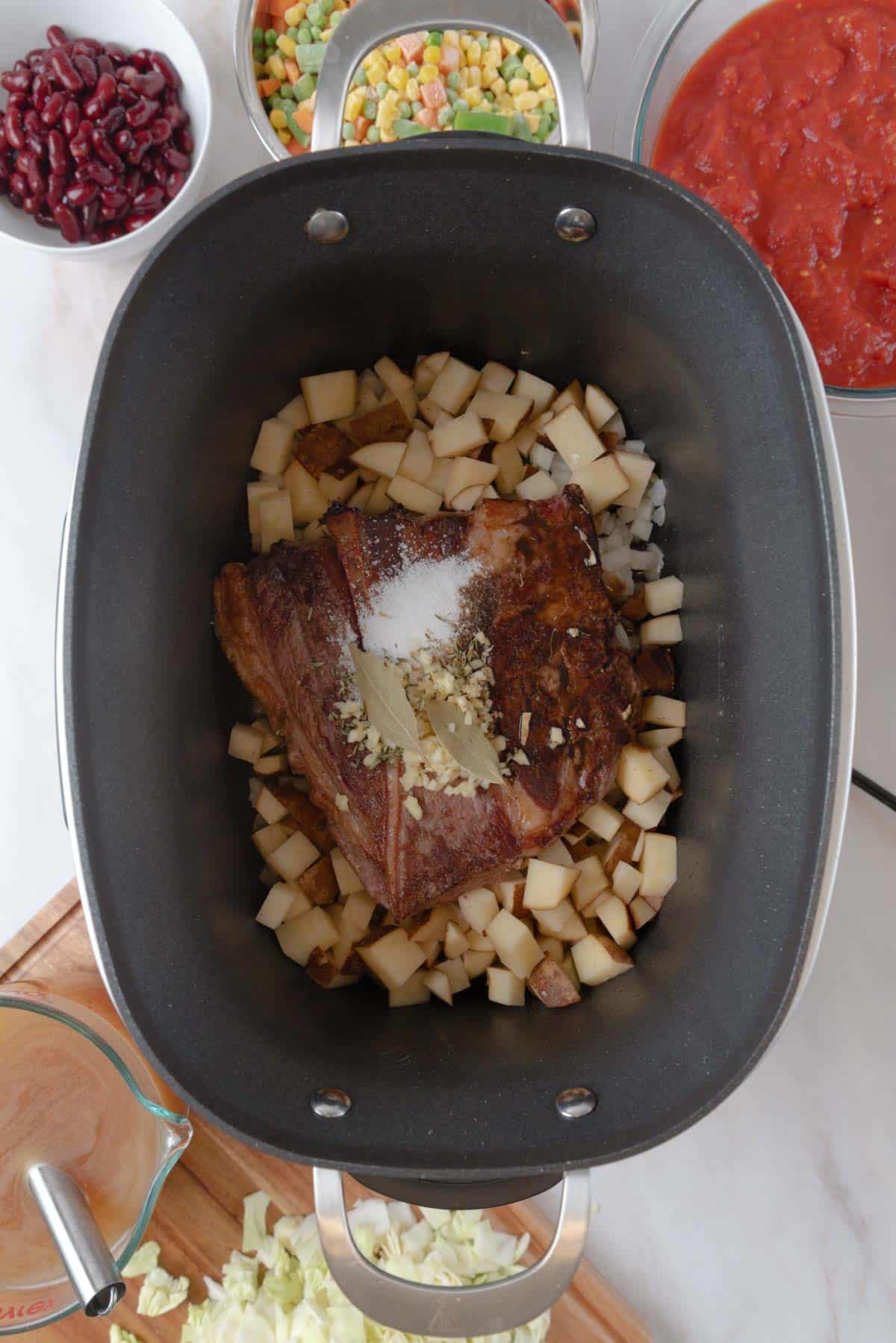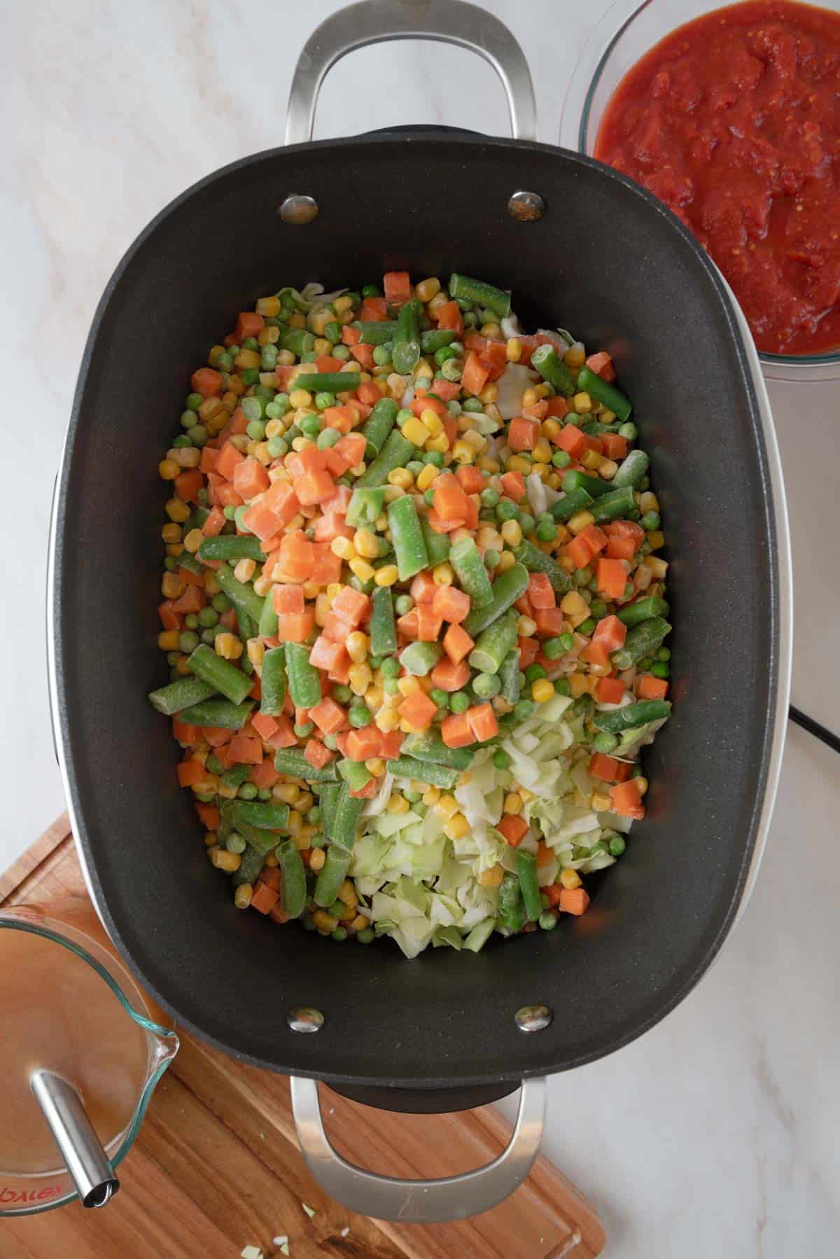 - Step 3: Place the rest of the chopped vegetables in the slow cooker.