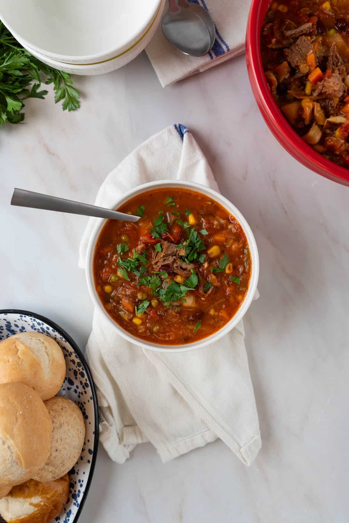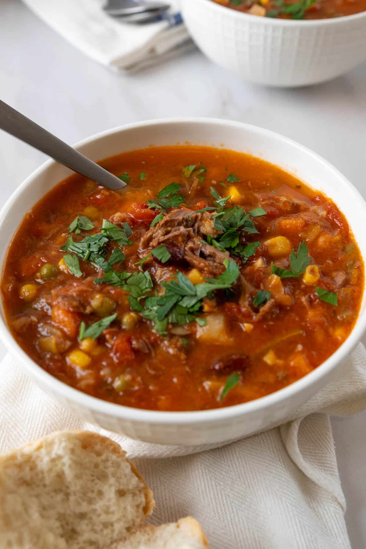 Vegetable beef soup is easy and so versatile. It's a perfect way to use up any vegetables in the fridge or toss in a bag of mixed vegetables from the freezer. Packed with tender beef, hearty vegetables, and a rich broth, this soup is an easy, hands-off way to create a satisfying meal in one bowl.