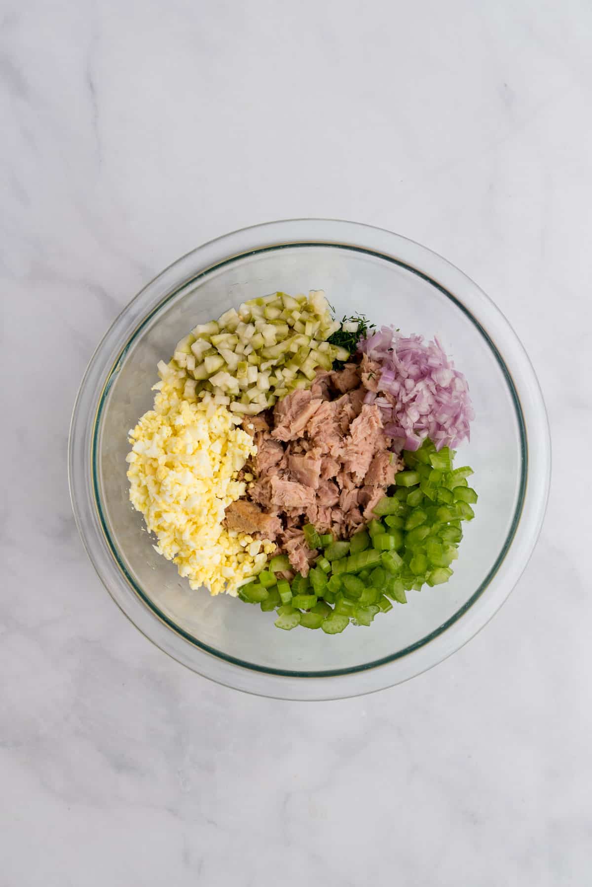 - Drain 2 cans of tuna well. This is important so your salad isn't watery and runny later. Place the tuna in a mixing bowl with VERY finely chopped egg, diced onion, diced celery, diced pickle (or pickle relish), and chopped dill. Stir until mixed thoroughly.